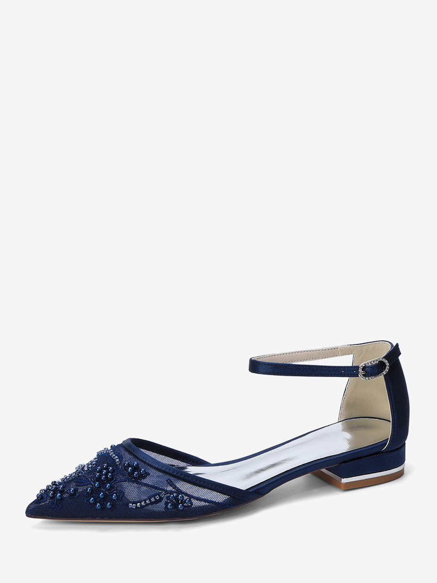 メッシュウェディングゲストシューズ ポインテッドトゥ ビーズフラットブライダルシューズ