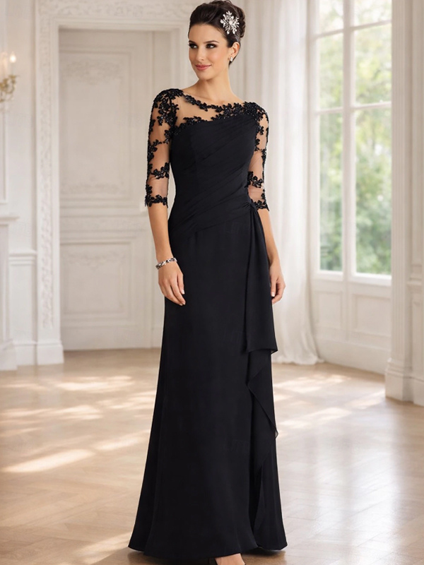 花嫁のマザードレスジュエルネック3/4レングススリーブシースプリーツボディコンロングウェディングゲストドレス