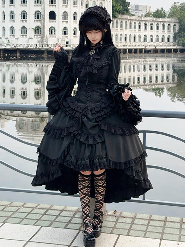 黒のゴシックロリータセットドレス、フリル、長袖、クラバットトップ、スカートのロリータドレス