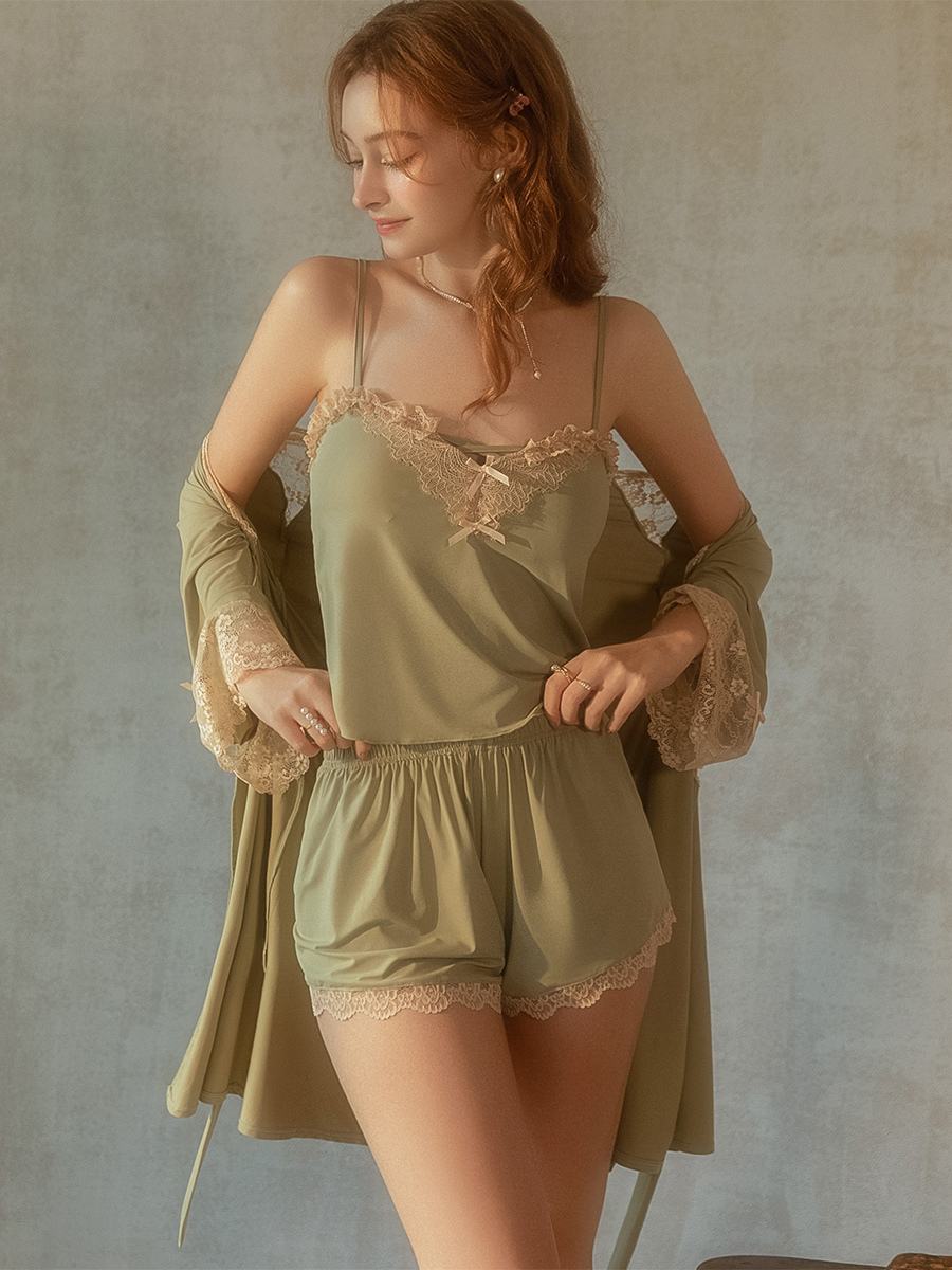 パジャマセット グリーン レース バックレス ランジェリー キャミソール ショーツ 2ピース ラウンジウェア