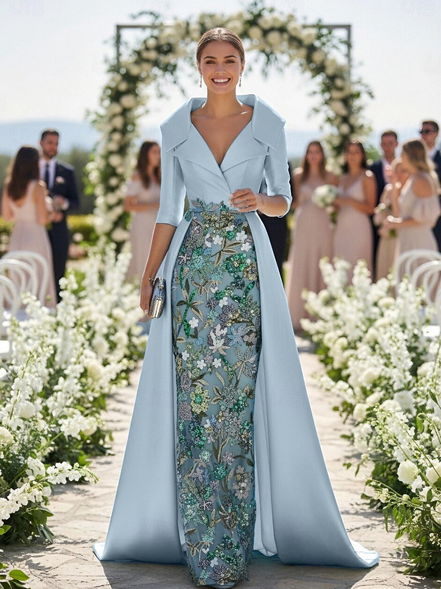 花嫁の母のためのパーティードレス Vネック 3/4丈袖 Aライン レース ウェディングゲストドレス