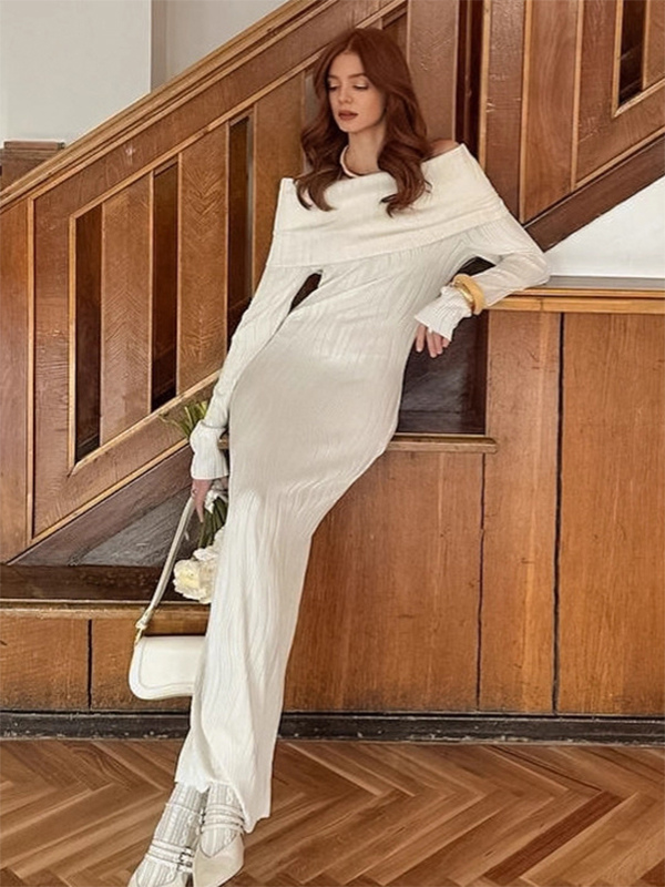 プリーツオフショルダーレディースマキシドレス - エレガントなクリームテクスチャボディコンガウン - 長袖パーティーウェア 2026