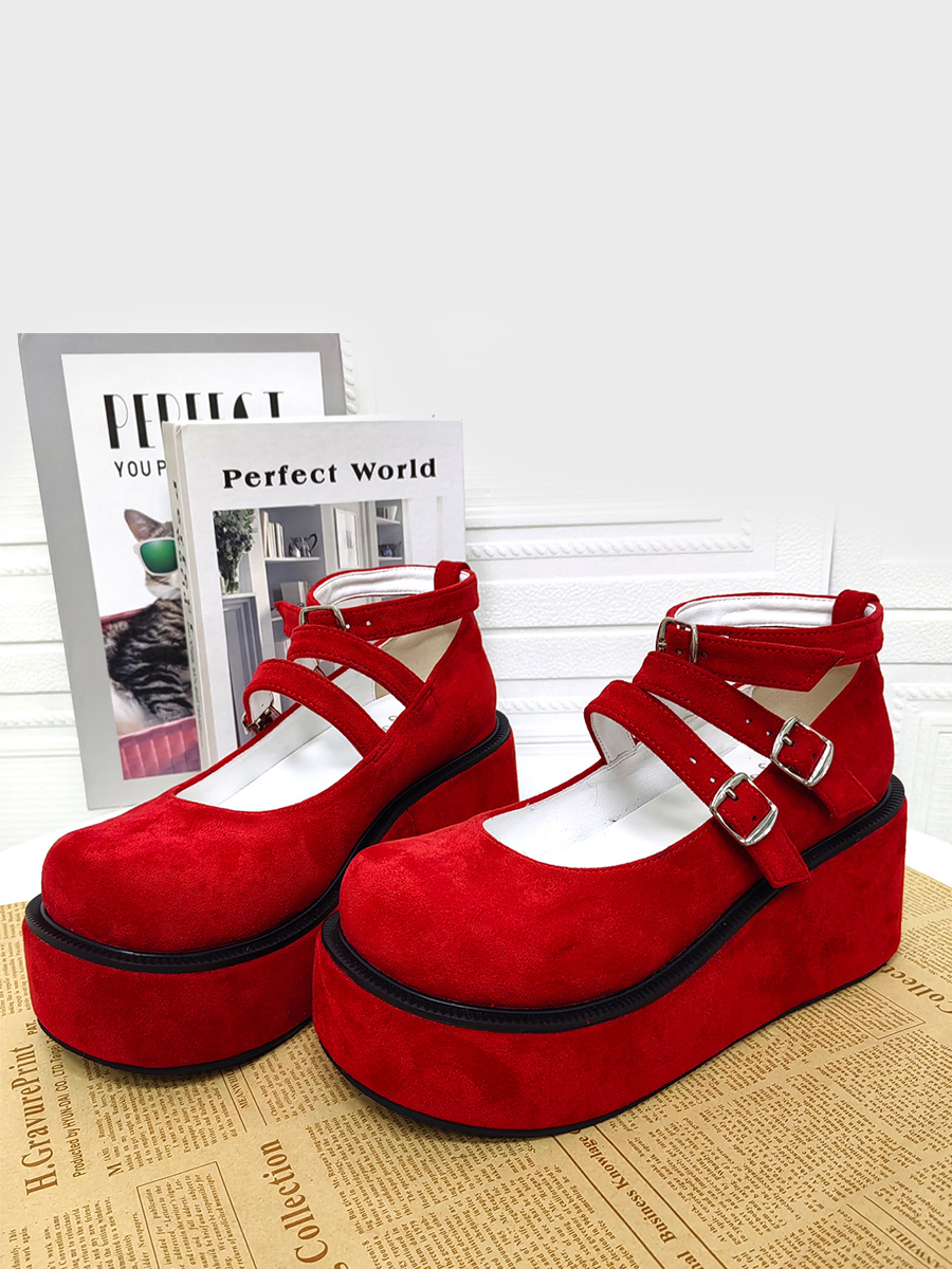 赤いロリータパンプス、プラットフォーム、アンクルバックル、ラウンドトゥ、PUレザー、ロリータシューズ
