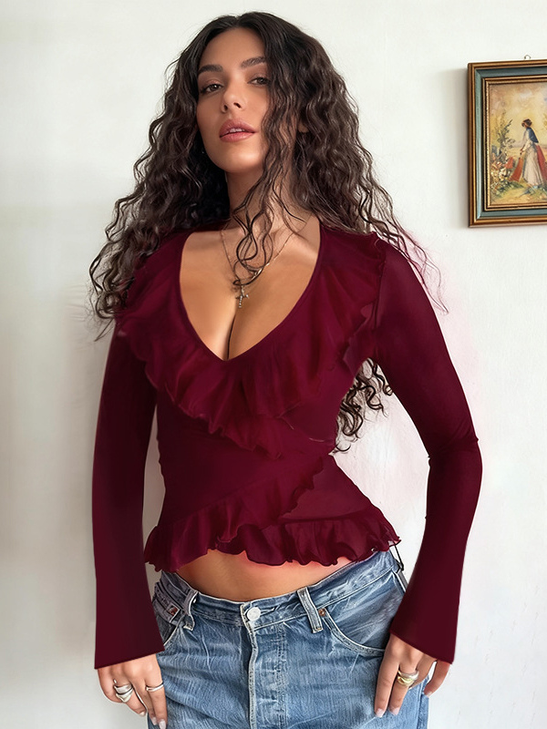 ロマンチックなフリル付きレディースラップトップ - Vネック長袖 - コケットな雰囲気の春のデートナイトウェア 2026