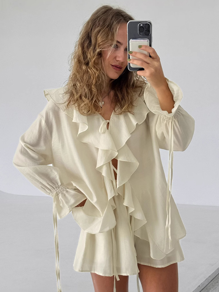 フリルシャツとショートパンツのツーピースセット(レディース) - クリーム色のボヘミアン風フレアスリーブ、フロントタイ - 夏のビーチバケーション衣装 2026
