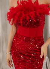 フェザー装飾とシースルーウエストのスパンコールボディコンミニパーティードレス 2025