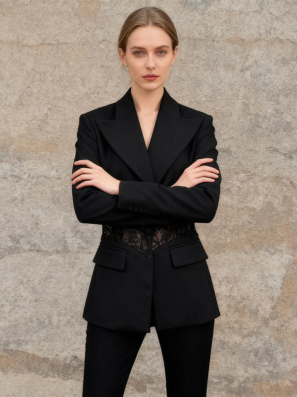 セクシーなレースパッチワークブレザー(レディース) - ブラックゴシックシースルーメッシュウエストスリムフィットスーツジャケット - 2026年春のイブニングパーティー