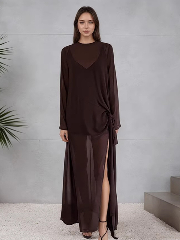 シースルーメッシュ 長袖 サイドタイ スリット マキシドレス カバーアップ レディース 2026