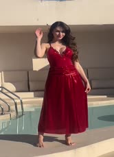 2025年夏のビーチにぴったりな光沢のある赤いVネック水着とロングスカートの2点セット