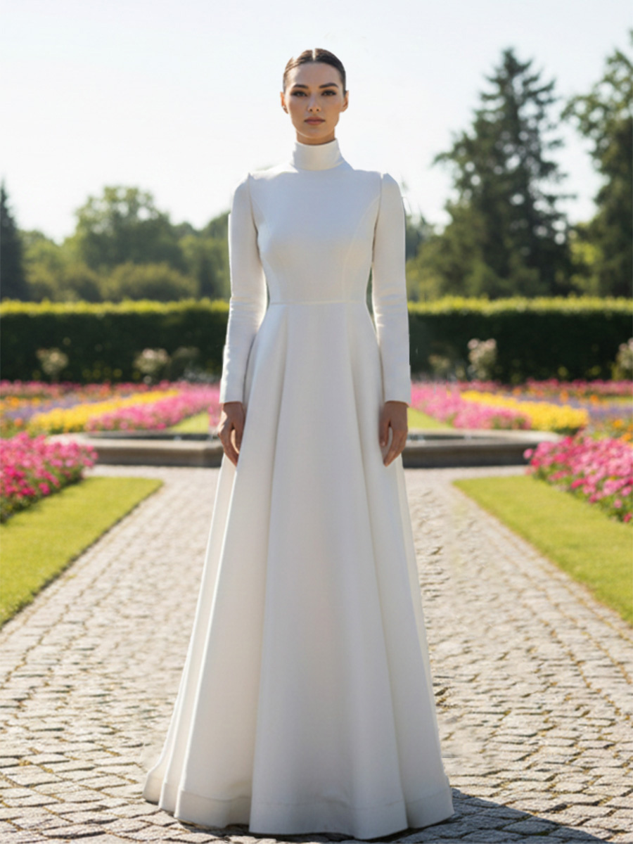 シンプルなウェディングドレス Aライン ハイカラー 長袖 ボタン付き ブライダルドレス