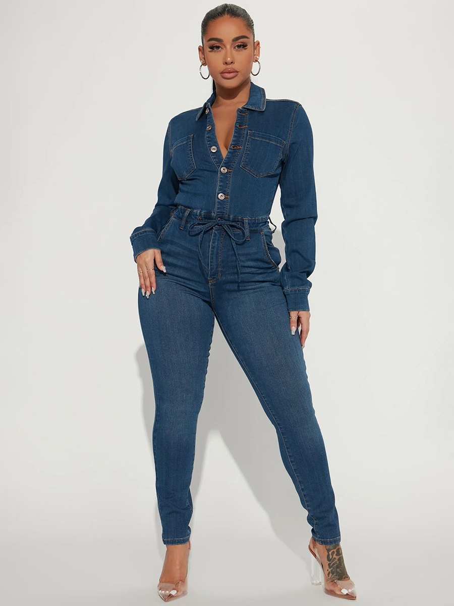 レディース用スキニーデニムジャンプスーツ - ダークウォッシュ セクシー ボディコン ドローストリングウエスト スリムフィット ジーンズロンパース - スプリングカジュアルクラブ 2026