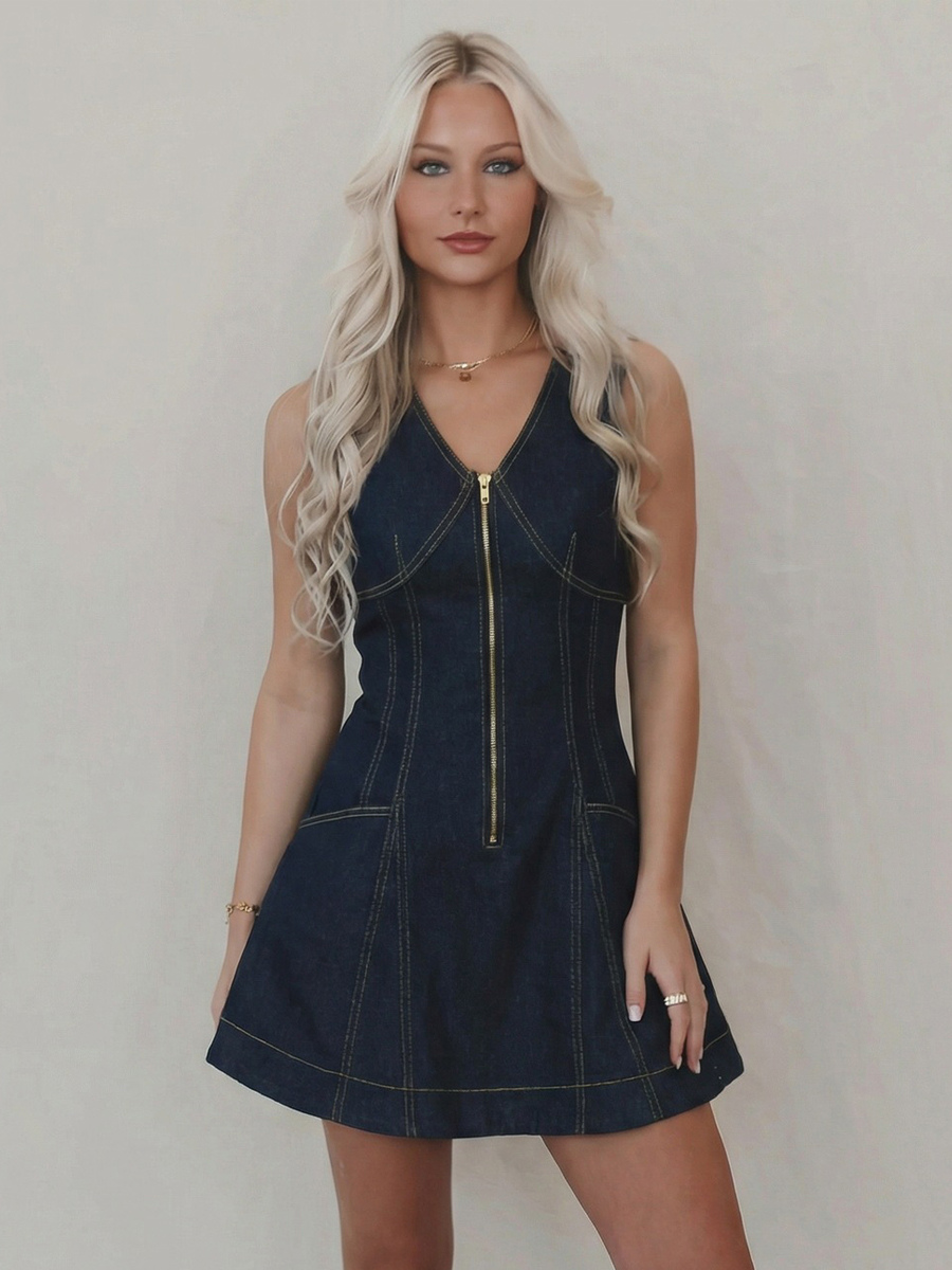 ノースリーブミニデニムドレス(女性用) - ダークブルーのウエスタンスタイル、フロントジップ、スリムフィットジーンズサマードレス - サマーミュージックフェスティバル2026
