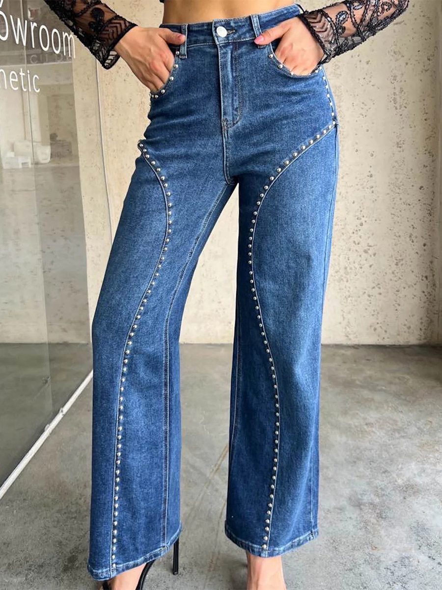 スタッズ付きストレートレッグジーンズ(レディース) - ミディアムウォッシュ レトロリベットディテール ワイドレッグデニム - 2026年春の夜のお出かけファッション