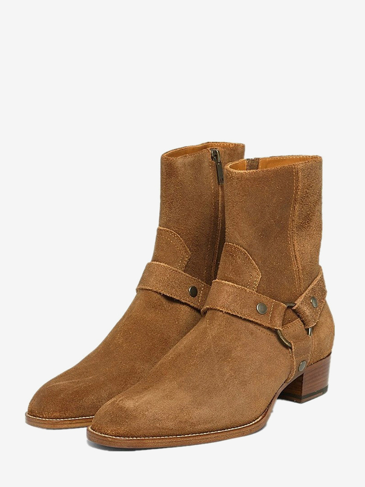 メンズ スエード アンクルブーツ ラウンドトゥ バックルディテール チャンキーヒール カジュアルブーツ