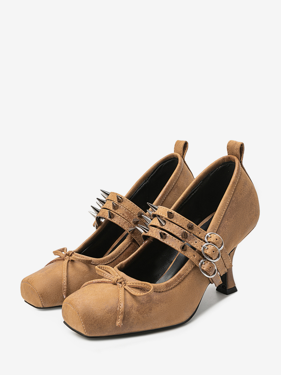 スエードハイヒール、リベットスクエアトゥハイヒール、メリージェーンシューズ