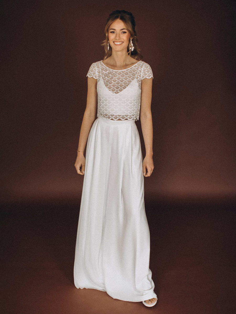 3ピースウェディングドレス シフォンレース イリュージョンネックライン ツーピース フロアレングス バックレス ショートスリーブ ロング ホワイト