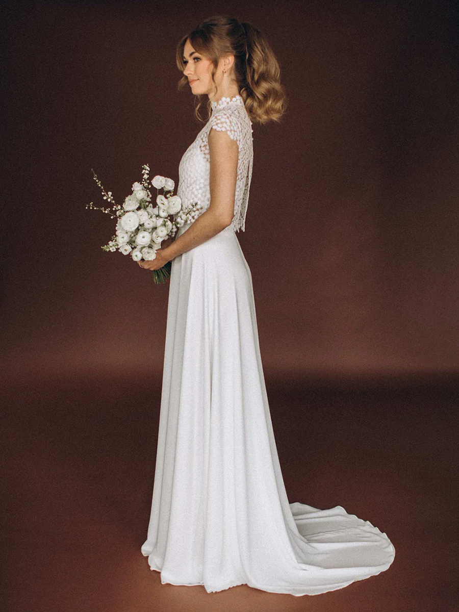 スリーピースウェディングドレス シフォンレース イリュージョンネックライン ツーピース トレーン付き バックレス 半袖 ロング ホワイト