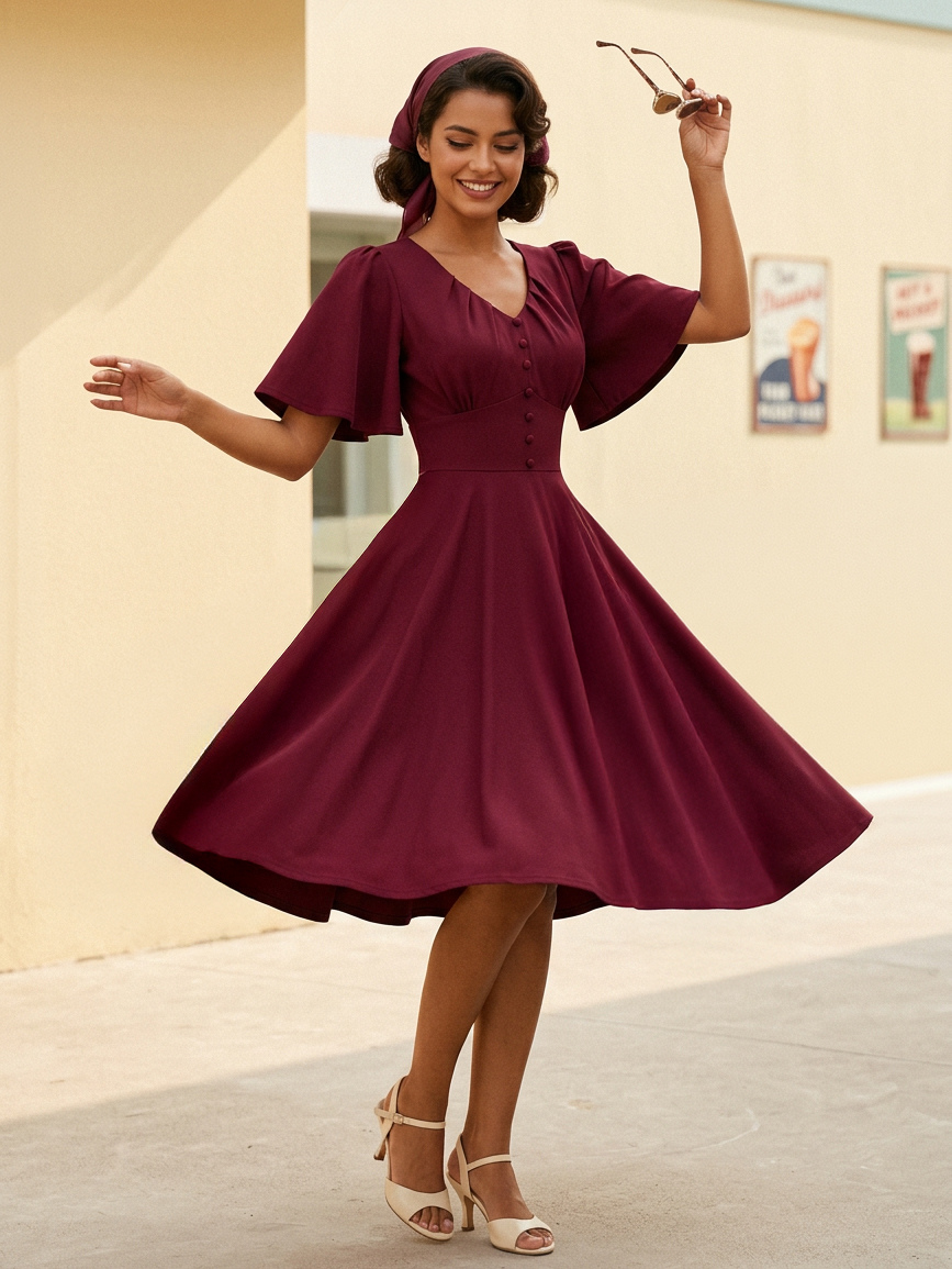 Vネック、ルーシュ、フロントボタン装飾、フラッタースリーブ、レトロスウィングドレス(レディース)2026