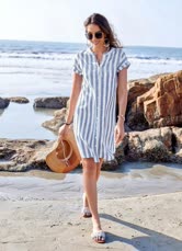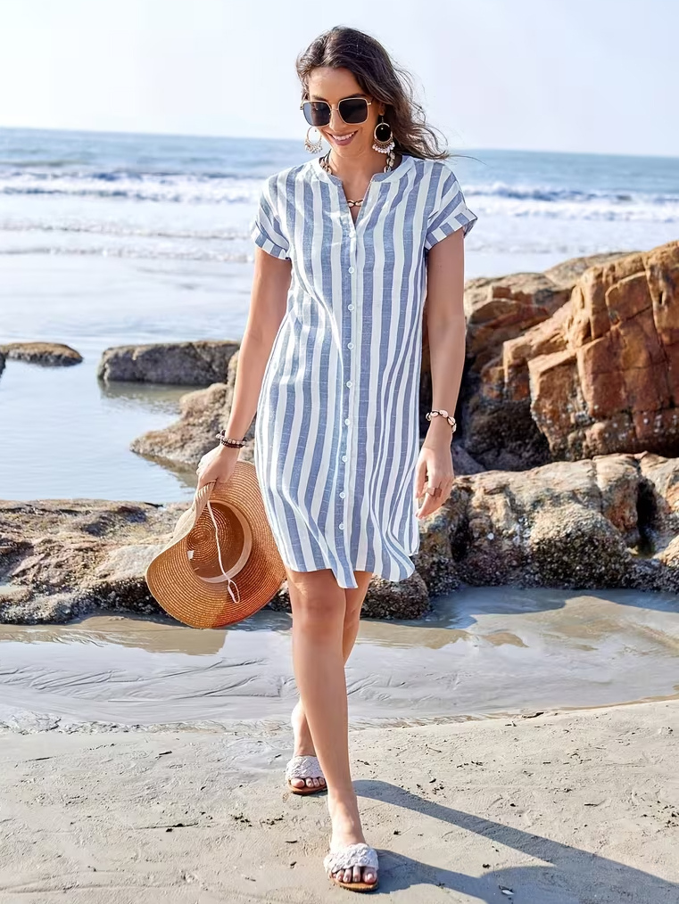 縦ストライプ柄レディースシャツワンピース - 半袖ボタンダウンミディドレス - 夏のビーチバケーション2026