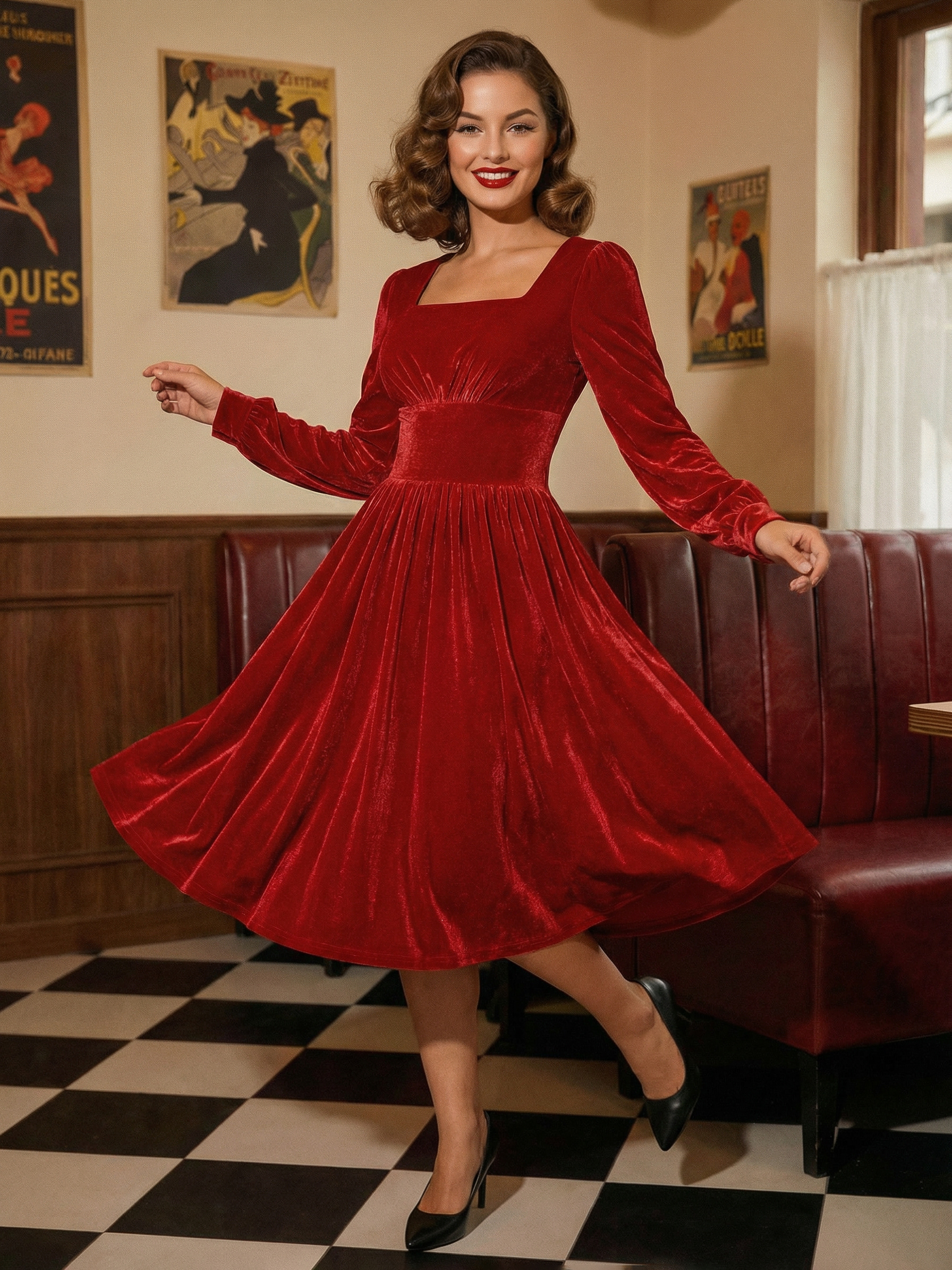 ヴィンテージドレス 1950年代オードリー・ヘップバーン風 長袖 スクエアネック ロカビリーワンピース 黒