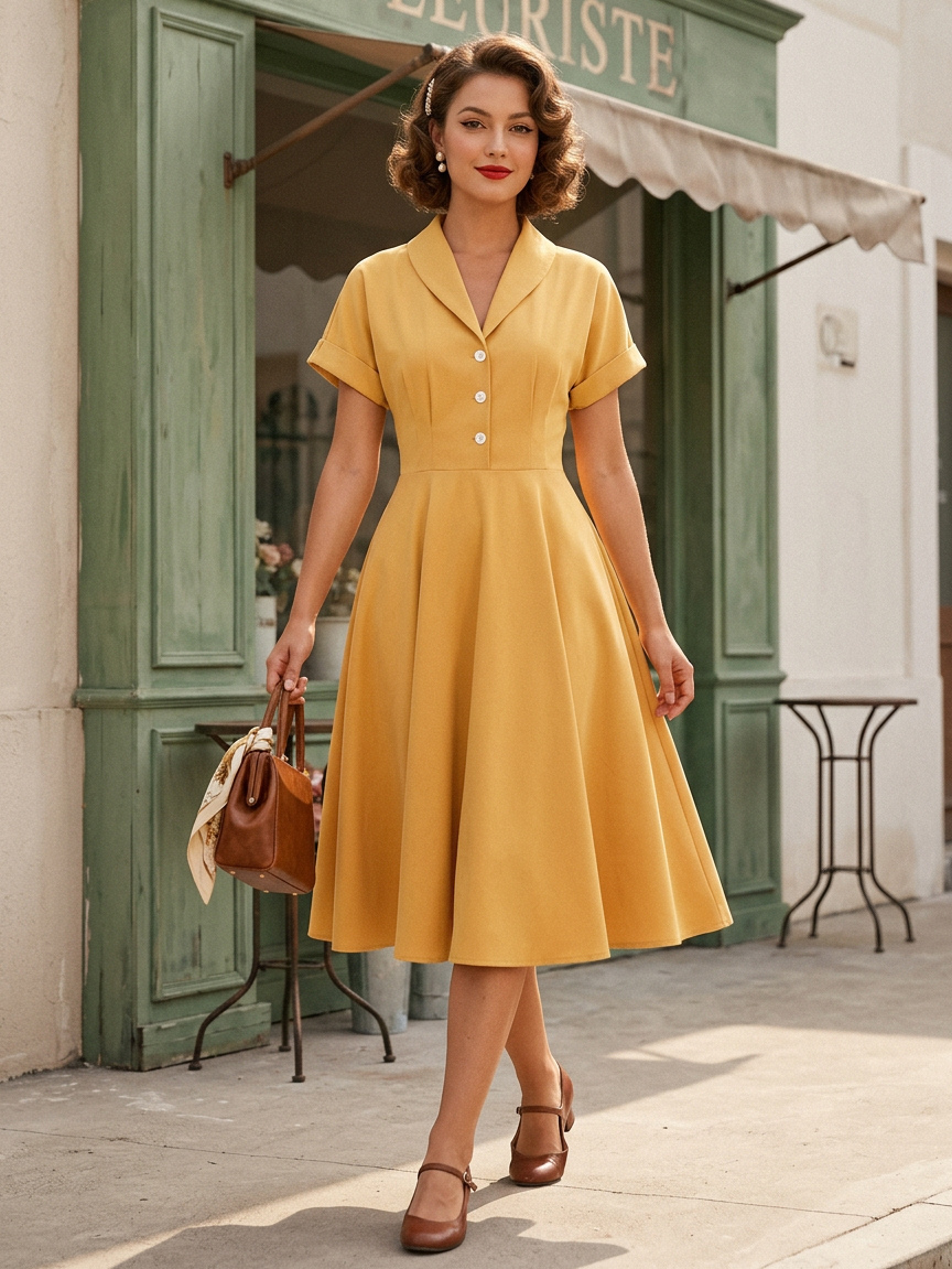 ヴィンテージ グラマー ドレス ターンダウン カラー ボタン 1950 年代 オードリー ヘップバーン スタイル 半袖 ミディアム イエロー ロカビリー ドレス