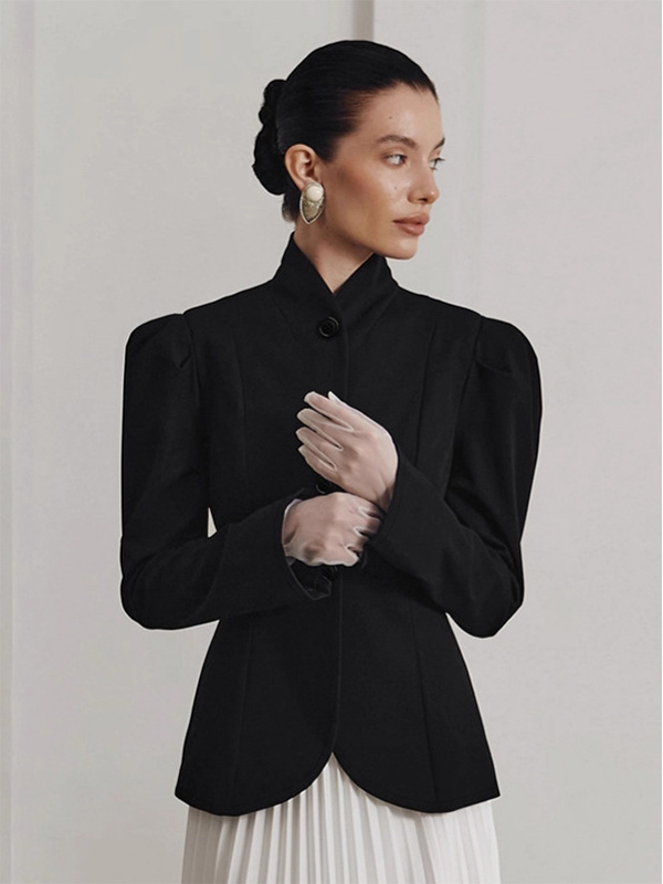 ヴィンテージ風ペプラムブレザー(レディース) - パフスリーブ、スタンドカラー、スリムフィットジャケット - シックな春のパーティアウター 2026