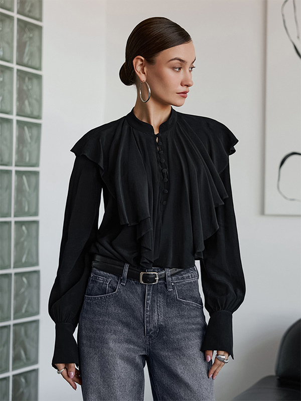 ヴィンテージ風フリルブラウス(レディース) - ブラック、エレガントなボタンアップ、ビクトリア調長袖トップス - 春のオフィスからディナーまで対応 2026