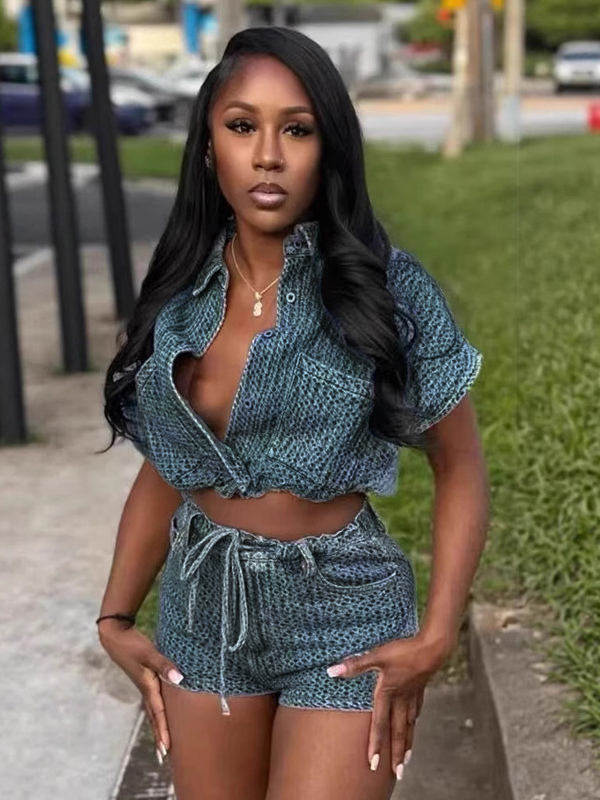 レディース用ワッフルデニム2点セット - ブルーの半袖タイフロントクロップトップとショートパンツのセットアップ - 2026年夏のカジュアルコーデ