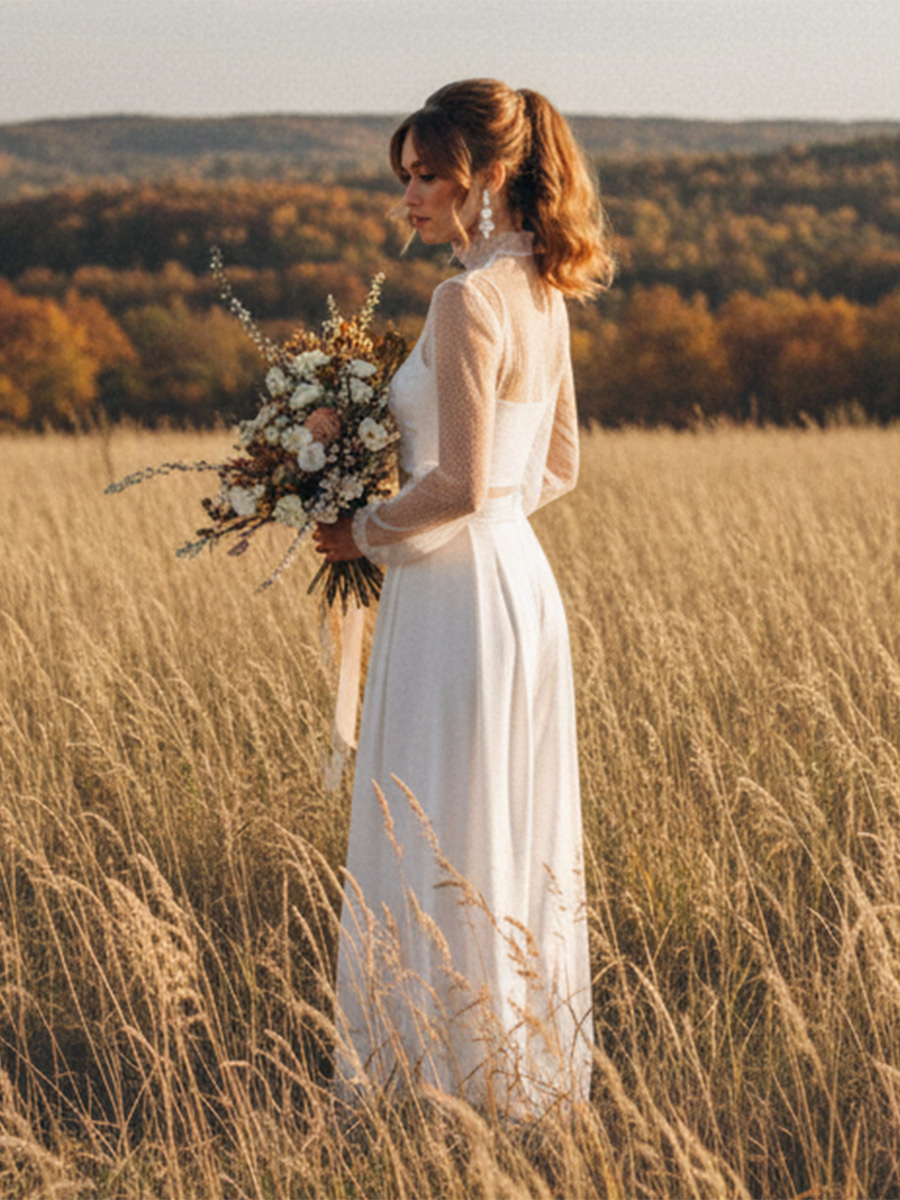 花嫁用ウェディング3ピースパンツスーツ レースシフォン イリュージョンネックライン ジッパー 長袖 フロア丈