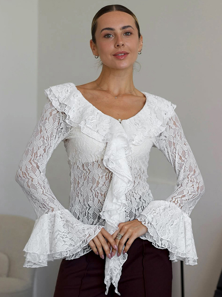 ホワイトフローラルレースのレディースブラウス - エレガントなフリルフレアスリーブシースルートップ - コケットフェアリーコアスプリングナイトアウトクラブウェア2026