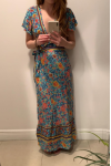 I bought this dress for my salon photo shoot. We did a boho theme and it turned out gorgeous! The front is low cut but not too low. The material felt great. The slit made the dress flow so beautifully. I bought an XL and it was loose like expected. I am 5'9 ”and weigh 175. The length was perfect and the pattern / colors looked so great in photos! I will definitely buy it in the other colors!perfect dress!!