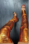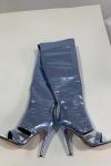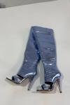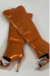 レビュー: ゴールドのオーバーニーブーツ、オープントゥ、メタリックストーン柄、太ももまでの高さのスティエットヒール、セクシーなブーツ