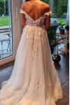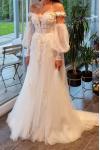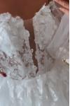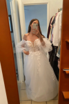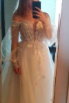 The small is beautiful and fits tailor-made on my body. However, I am extremely disappointed by the tulle sleeves.... They are way too short. This looks disastrous... I am trying to reach the manufacturer for new sleeves. So I can not wear the dress to my wedding... and that although I have given the exact measurements.