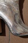 レビュー: ニーハイブーツシルバースクエアトゥスネークプリントチャンキーヒールブライトレザー女性の膝丈ハイヒールブーツ