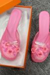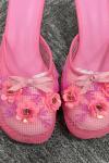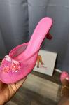 ピンクのハイヒールミュール メッシュ ラウンドトゥ 花柄 バックレス パンプス