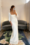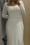 Magnifique robe! Je craignais d'acheter une robe de mariée sans l'essayer et j'adore le rendu! Le tissu est comme en crêpe et j'ai pris un 38 qui taille très bien.