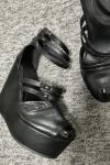 ウェッジサンダルブラッククローズドトゥスティレットヒールPUレザーブラックアンクルストラップウェッジヒール