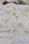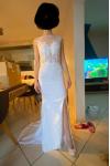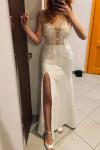非常に美しいドレス。パーソナライズされたサイズで撮影され、完璧にフィットします。電車に乗って歩くのは面倒なので、手首に電車を固定するものを追加します。大きなマイナスポイントは、胸の高さで、真ん中にワイヤーで取り付けられた大きなパッドカップが2つだけで、私の胸に比べて幅が広すぎます。脱いでブラジャー姿で見てみます。それ以外はとても素敵な仕上がりで、とても満足しています。後ろのボタンに注意してください。取り付けるのは本当に面倒です。