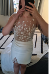 レビュー: ホワイトショートウェディングドレスイリュージョンネックラインジュエルネックノースリーブシースナチュラルウエストボディコンショートブライダルドレス