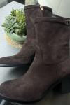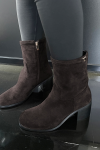 レディース アンクルブーツ ディープブラウン スエード ラウンドトゥ チャンキーヒール ブーティ
