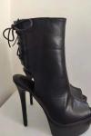 レビュー: 女性のセクシーなサンダルブラックPUレザーオープントゥスチレットヒールセクシーなハイヒールのブーツ