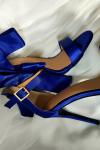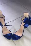 レビュー: ブルーハイヒールサンダルサテンオープントゥフラワーイブニングシューズレディースパーティースティレットヒール
