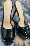 レビュー: 女性スティレットヒールスリッポンサンダルセクシーシューズパテントPUアッパーブラックヒールミュール