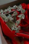 レビュー: サテンの結婚式の靴赤のオープントゥラインストーンレースアップブライダルシューズハイヒールのサンダル