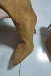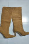 レビュー: 女性の前かがみのブーツスエードはつま先のハイヒール膝の高いブーツを尖らせる