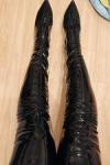このブーツは「HOT」に見えます。写真のように非常にタイトなフィッティングです。少し伸縮性がありますが、足が太い人には合わないでしょう。私の妻はそれを十分に気に入っていたので、私たちはこのブーツも光沢のある黒い色で購入しました。
