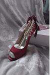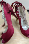 女性用ウェディングシューズ サテン バーガンディ ピープトウ ラインストーン チャンキーヒール ブライダルシューズ